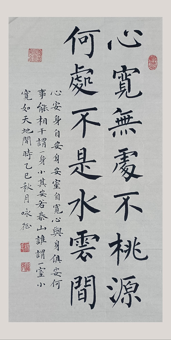 这份由黑龙江书友杨向刚老师创作的柳体书法作品,展现了深厚的传统功底与清雅的文人气息。柳体书风素有“柳骨”之称,以瘦硬挺拔、骨力遒劲著称,这幅作品精准地捕捉到了柳公权书法的精髓,并将其与儒道禅意完美融合,给人以一种宁静而有力的视觉冲击。
