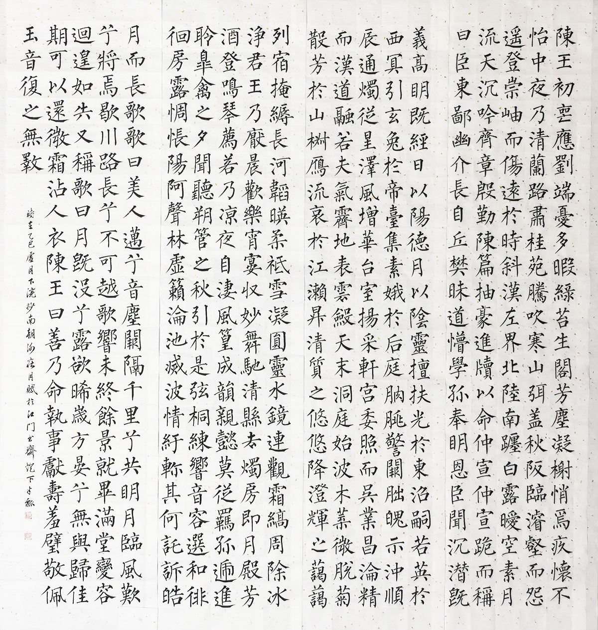 魏炳惠先生笔下的柳体,并非一味的干枯瘦削,而是深得《神策军碑》神韵。其起笔之处往往方折果断,如刀刻斧凿,收笔时则含蓄内敛,力透纸背。每一个横画的仰俯、竖画的挺拔,都交代得极其法度严谨,毫无轻浮之气。特别是在处理长撇与大捺时,其线条如同万岁枯藤,既有老辣的质感,又不失灵动的节奏,使原本静态的楷书在规整中产生了一种内在的律动感,这种对“度”的把握,足见书者在楷书法度上的多年沉潜与修持。
