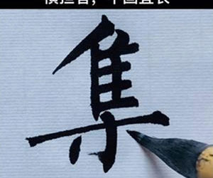 运用三个撇画的字(如“参”、“杉”),最下面一个撇画的起笔处,应该对准上面一个撇画的中间腹部。